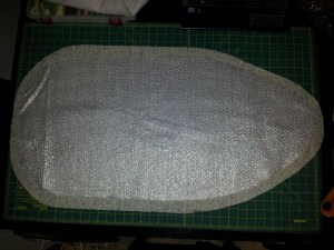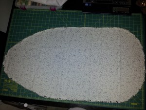 Now lay your batting onto the wrong side of your fabric and use your marker to create an outline an inch larger than your batting stencil. I would suggest putting the shiny side down, if your batting has one (the opposite of what I did in the picture) in case your stencil isn’t quite symmetrical (it’s fine if it isn’t).