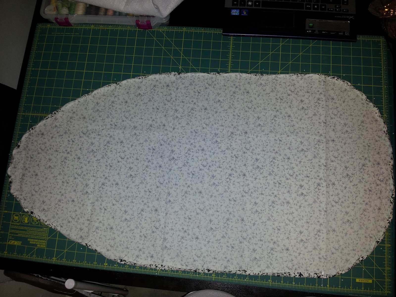 I chose this fabric because it’s off-white and looks antique. I figure that, as I spilled Best Press and what-have-you on the cover, it would just add to the antique look.
