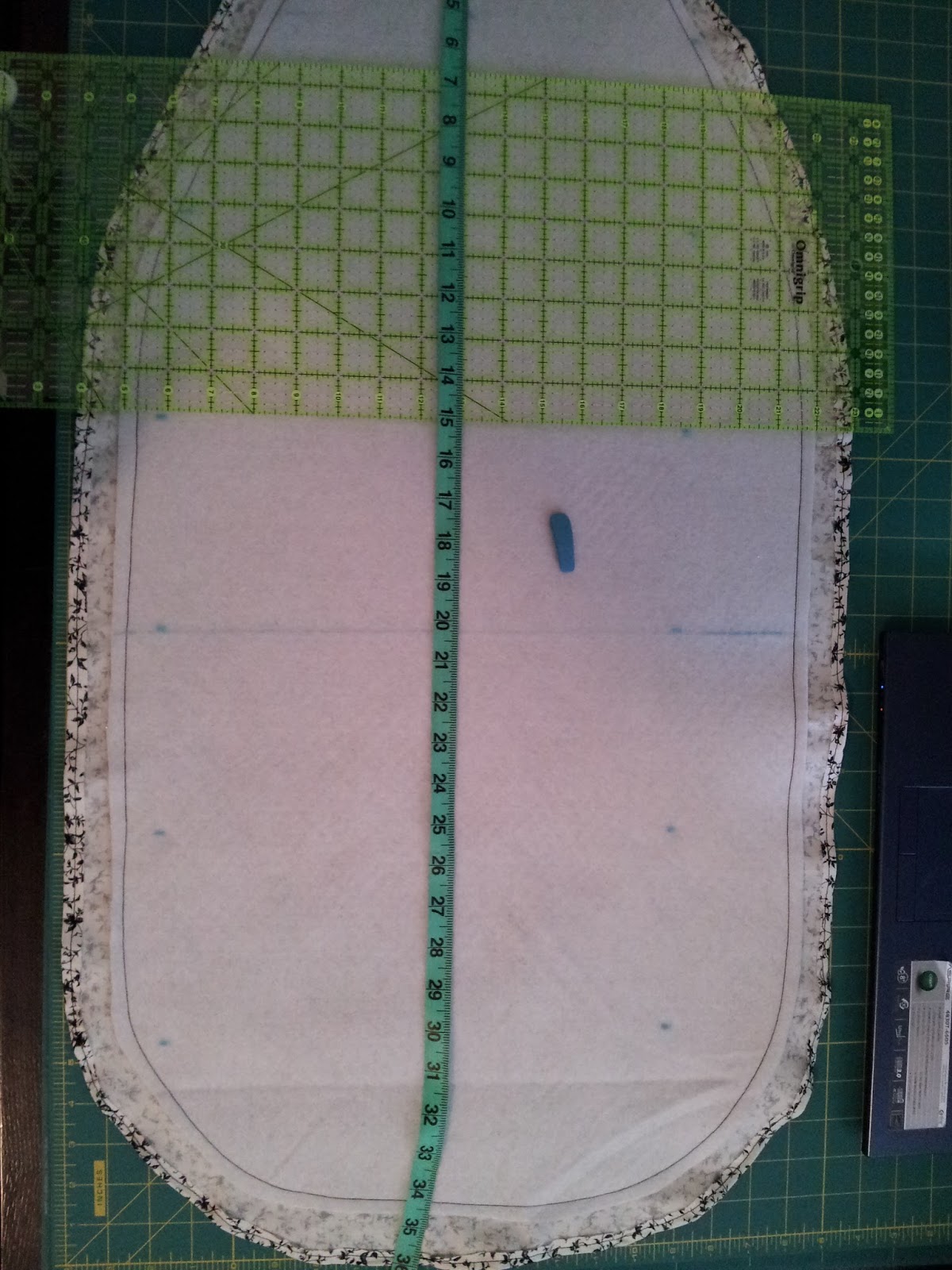 Lay your ironing board on top of your batting and use a marker/chalk to create an outline 2″ (5 cm) from the edge of your board. Cut this outline out. Repeat if using more than one layer of batting. (You can eyeball this, if you’re confident, or you can measure it out)